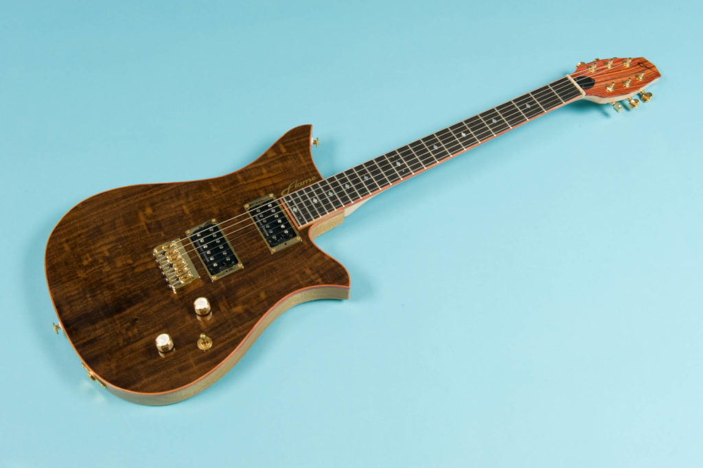 Recently I acquired my first hand-made guitar, a Flame F2 made by David Kennett in Sutton. The top is imbuya on a korina body. The fretboard is ebony and there’s also a small amount of tulipwood, maple and mahogany in the body. The scale length is 25 in, between the Epiphone and the Fender.